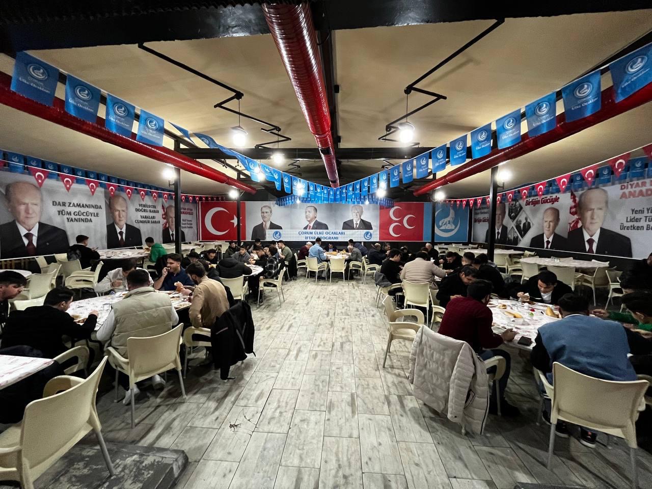 Ülkü Ocakları Çorum İl Başkanlığı tarafından yapılan paylaşımda “Gönül kapılarımızın daima açık olduğu kıymetli misafirlerimizle bu Ramazan ayında da iftar soframızda helal lokmamızı bölüşüyoruz. Hayırseverlerimizle ihtiyaç sahibi ailelerimiz ve öğrenci kardeşlerimiz arasında gönül köprüsü kurmaya devam ediyoruz.” İfadeleri kullanıldı.